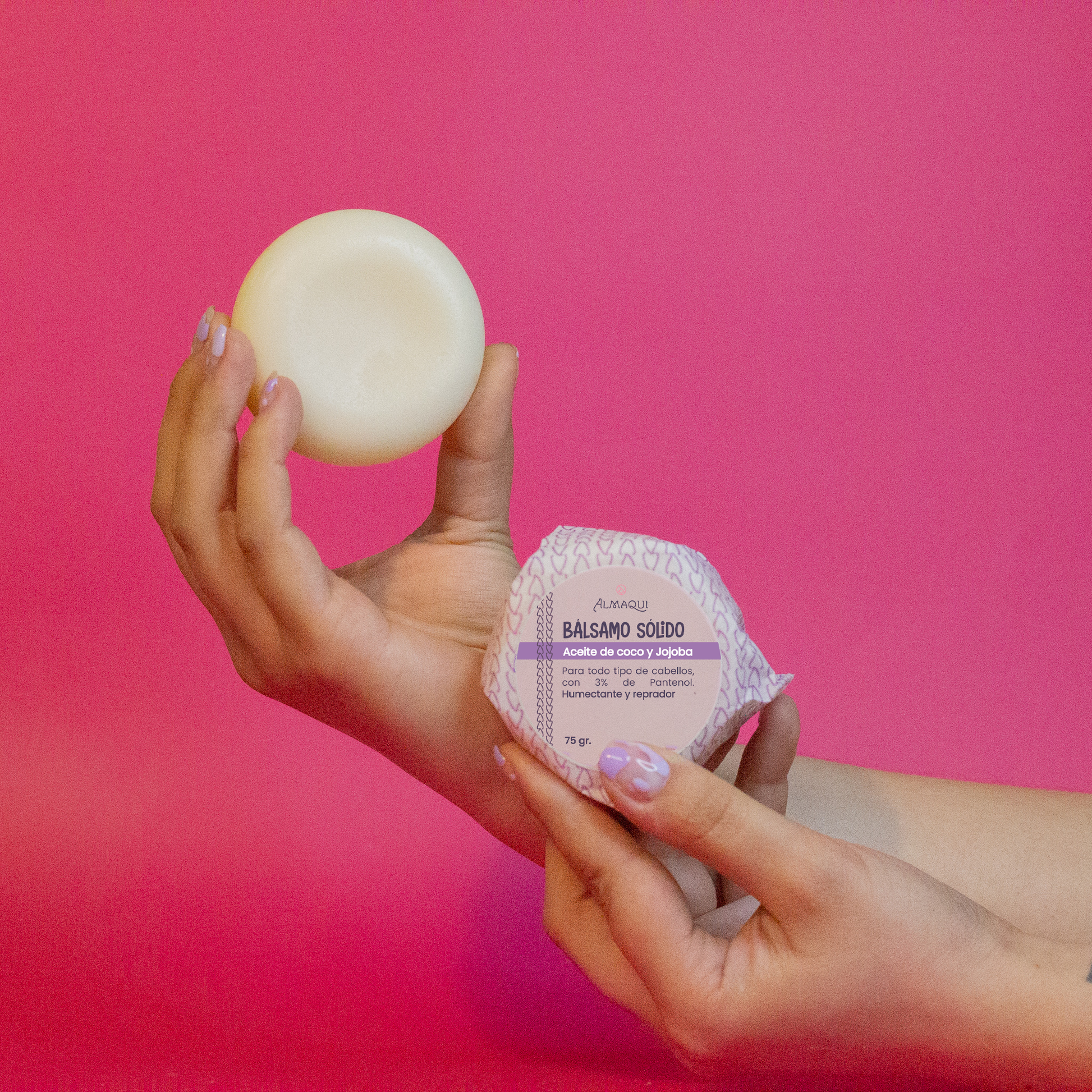 2. Toma la barra de bálsamo: Sostén la barra de bálsamo capilar sólido con las manos. Si es necesario, frota un poco la barra entre tus manos para suavizarla.